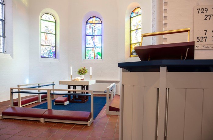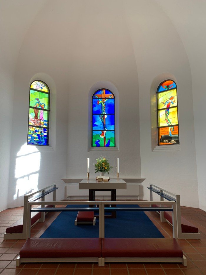 Via linkene nedenfor kan du gå på opdagelse i kirketårnet, se kirkeklokken på nært hold, se skitser af sædemanden og mosaikrosetten over indgangspartiet. Du kan også se billeder af kirkerummet som det så ud i 1984 og læse mere om de symboler, som træder frem i korbuens glasmosaikker og de 12 kantede lysekroner i kirkerummet.