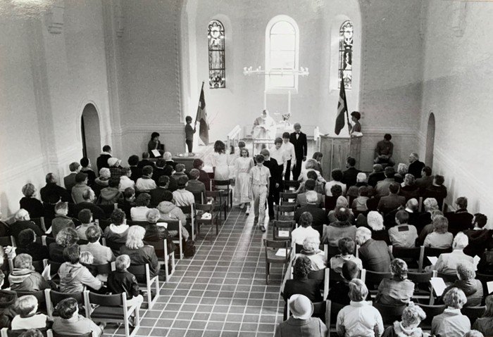 Læs mere om glasmosaikkens historie i Vanløse Kirke :