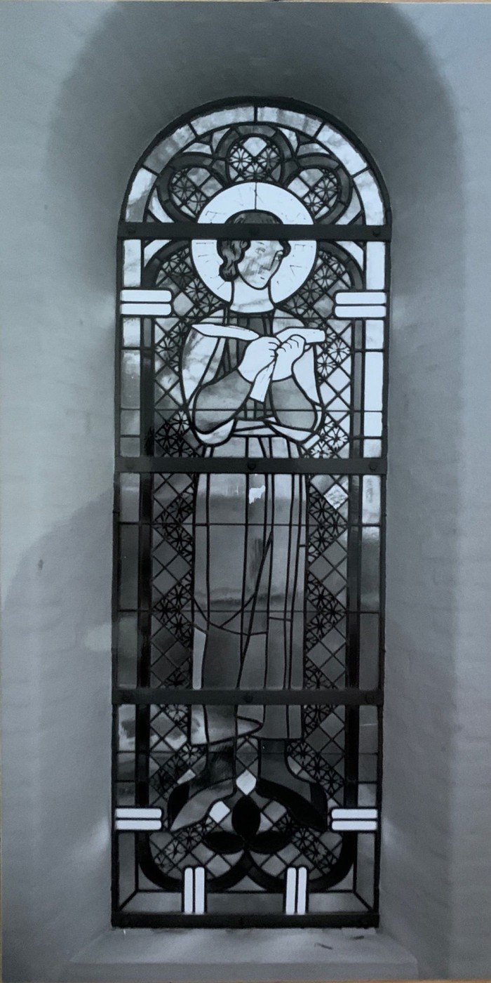 De to glasmalerier blev sat op i den tresidede korvæg til højre og venstre for det oprindelige krucifiks og sad frem til 1984. I 1988 blev billedkunstneren Arne Hauge Sørense opfordret til at udsmykke korvæggen med tre nye glasmosaikruder. Krucifikset blev nedtaget, og der blev tilføjet et tredje vindue i væggen. De oprindelige glasmalerier blev nedtaget og gemt i kirkens tårn.